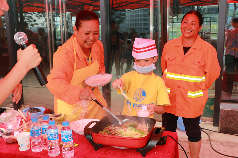 搶答活動結(jié)束之后,進(jìn)入“小廚神”廚藝大比拼環(huán)節(jié)。由園林綠化工人、水電維修物業(yè)工人、保潔人員等進(jìn)城務(wù)工人員組成的5組家庭展開了激烈的廚藝大比拼競賽。看,小廚神們在父母的指導(dǎo)下井井有條地備菜、炒菜、起鍋,忙得不亦樂乎。各色菜式色香味俱全,充分展現(xiàn)了孩子們“小當(dāng)家”的本領(lǐng)。半小時后,小廚神們在大家的熱烈掌聲中完成了比賽菜品,廚藝大師及現(xiàn)場觀眾根據(jù)完成的速度、菜品、味道等評出廚藝大賽一等獎1名,二等獎2名,三等獎3名,優(yōu)秀獎10名。