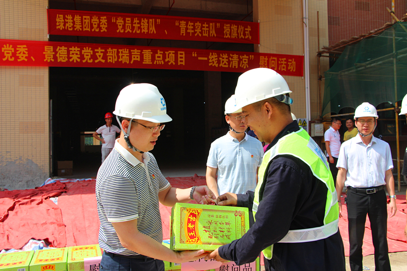 綠港集團(tuán)黨委書記、董事長(zhǎng)、總經(jīng)理龔國(guó)強(qiáng)給一線員工送上清涼飲品