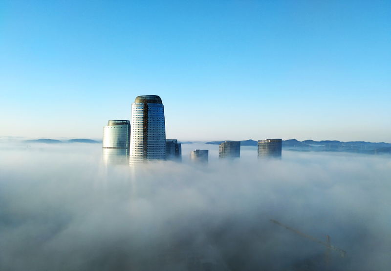 《晨曦 綠港》(榮鑫公司 趙志業(yè))圖片說(shuō)明:綠港國(guó)際中心在晨曦和白霧的襯托下,顯得格外漂亮。
